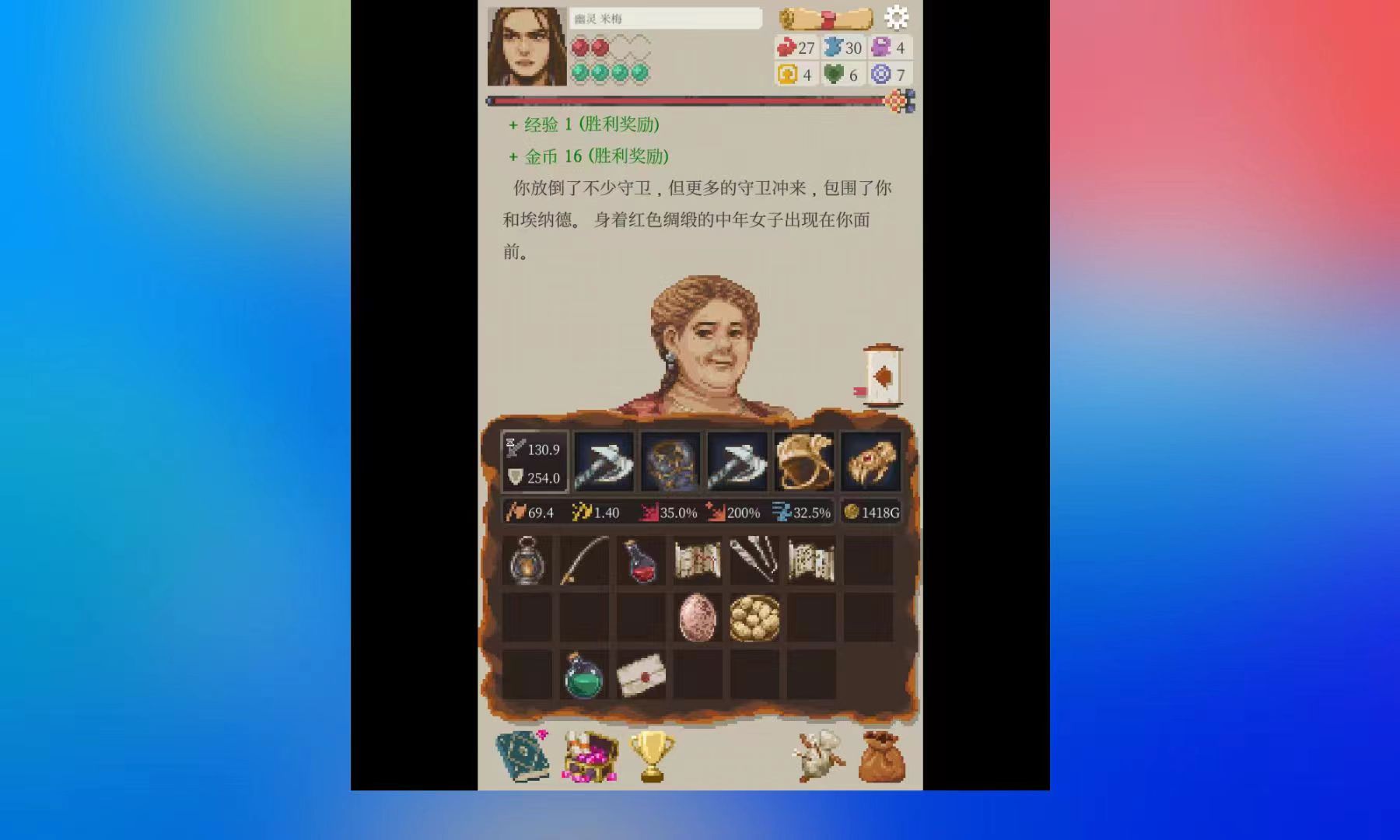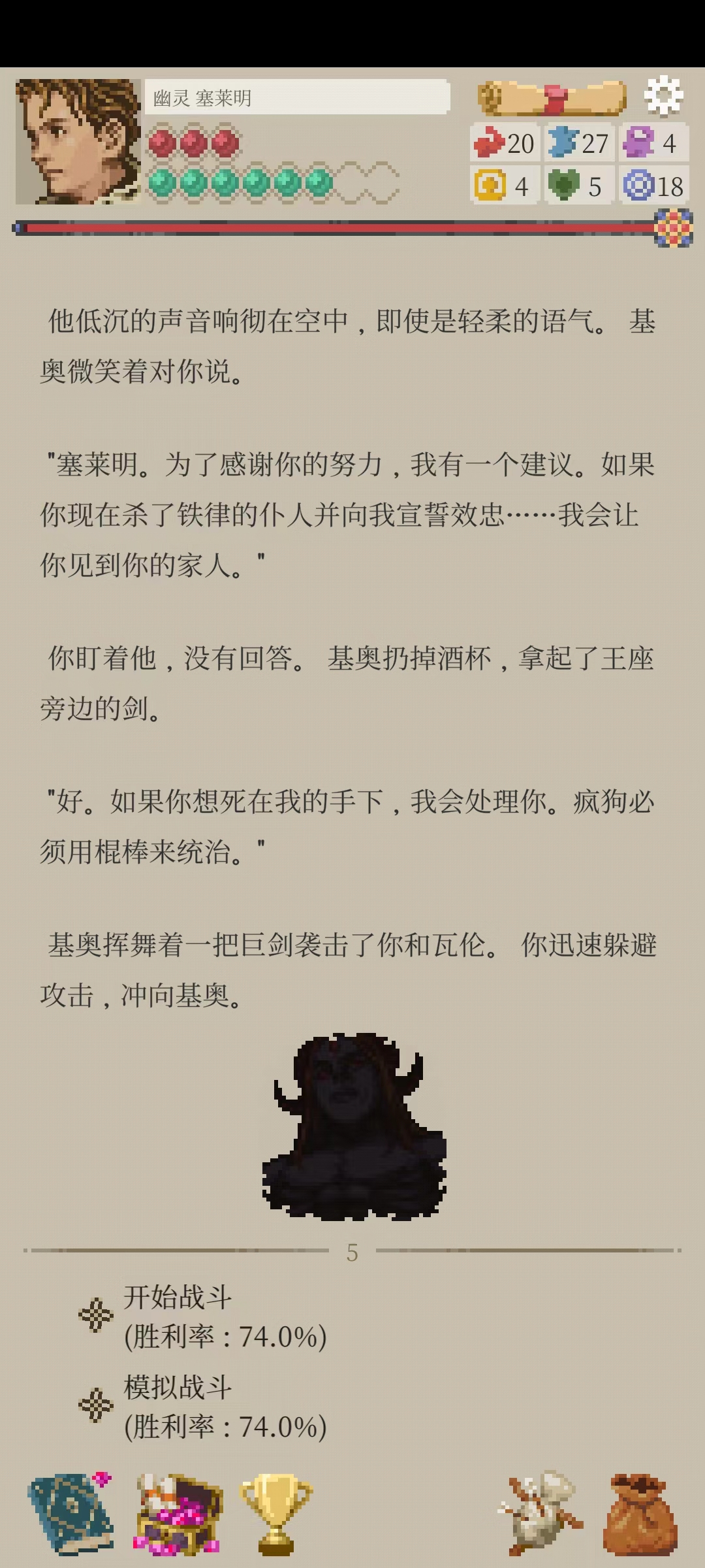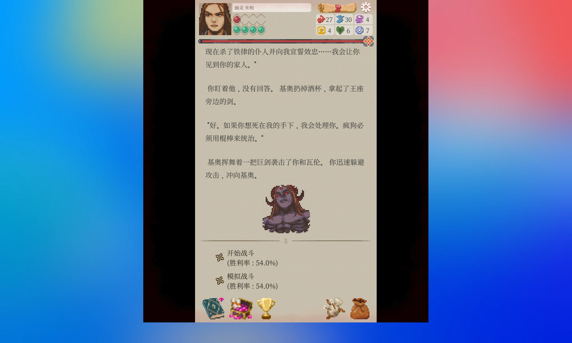 看图,护甲加10闪避,搭配遗物,闪避率已经近60%。60%的闪避率其实还不算高,但模拟战打了几次都能过(虽然显示胜率只有10%左右)