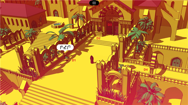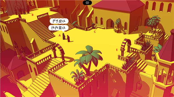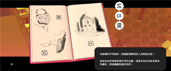 D处通向传送仪器。左下是传送界面,解锁更多传送点后可进行传送。右下是真结局需要的翻译关卡,需要将两边的语言进行翻译。